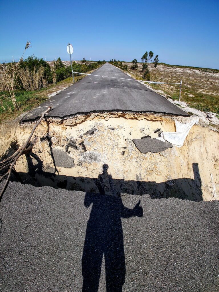 Am Morgen haben wir Frost an unserem Zelt, entsprechend kalt sind die ersten Kilometer. Doch dann beginnt die Sonne uns kräftig einzuheizen. Nach unserem Ausflug ins Inland, nähren wir uns heute wieder dem Meer. Schnurgerade fahren wir durch wüstenartige Dünen. Die Pause im weichen warmen Sand soll am liebsten nie enden. Aber irgendwann wollen wir ja doch am Campingplatz ankommen. Der Wind ist in der Zwischenzeit stärker geworden und wir müssen ganz schön gegen ihn ankämpfen, um vorwärts zu kommen. Immerhin ist die Straße unter uns ganz neu gemacht – glatter Asphalt ohne Schlaglöcher. Um so erstaunter sind wir, als es plötzlich nicht weiter geht. Eine Brücke war wohl nicht Teil der Fahrbahnsanierung und so klafft ein Abgrund vor uns. Der Ast, der die beiden Seiten verbindet, dient höchstens Ameisen zum Überqueren des Flusses. Für uns keine Chance. Da hilft nur umkehren und einen anderen Weg durch die Dünen nehmen.