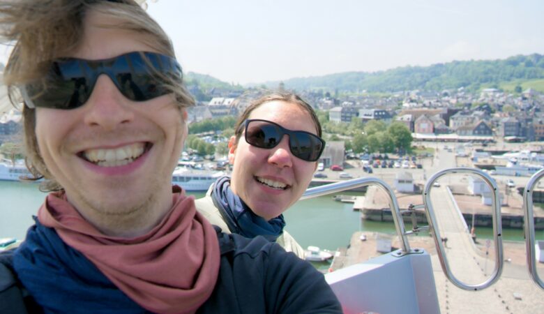 Der Wind hat glücklicherweise etwas nachgelassen, sodass wir die sanften Strahlen der Sonne richtig genießen können. Als wir an einem Riesenrad bei Honfleur vorbeifahren (auch hier ist heute buntes Treiben – ein Flomarkt!), entschließen wir uns spontan eine Runde zu fahren. Von oben können wir schon einen Blick auf die Pont de Normandie, europas größte Schrägseilbrücke und damit unseren heutigen Endgegner, erhaschen. Es ist ein Sonntagmittag im Mai und offensichtlich sehr wenig Verkehr. LKWs dürfen nicht fahren und der durchschnittlichen PKW-fahrer sitzt vermutlich gerade gemütlich zu Tisch. Unser Glück, denn zeitlich schaffen wir den empfohlenen Umweg, um die lange Brücke mit ihrem zu schmalen Radstreifen, nicht. Dieser würde eine Tagesetappe extra bedeuten und unser Apartment ist für heute gebucht. Wir wagen also die lange Überquerung der Seine und Dank der optimalen Randbedingungen gelingt es ohne Probleme und Stress. Nur der eine uns überholende LKW, der Wohl eine Ausnahmegenehmigung hat, gibt uns ein Gefühl wie unkontollierbar ein Fahrrad auf exponierter Brücke im plöztlichen Luftzug eines großen Gefährts werden kann. Die Einfahrt nach Le Havre ist dann ein Kinderspiel. Es geht durch das riesige, sonntags jedoch komplett leere Hafenareal (der Name ist Programm) und weiter auf Radwegen in die Innenstadt zur Unterkunft. Jetzt stehen drei Tage Entspannung und Geburtstagsvorbereitungen an.